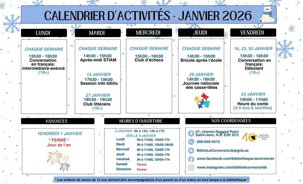 Située au 2ème étage du centre communautaire Samuel de Champlain , la bibliothèque propose chaque semaine des ateliers de conversation en français, de lecture, de technologies, d’art et d’echecs. On en parle avec Annette Boudreau.